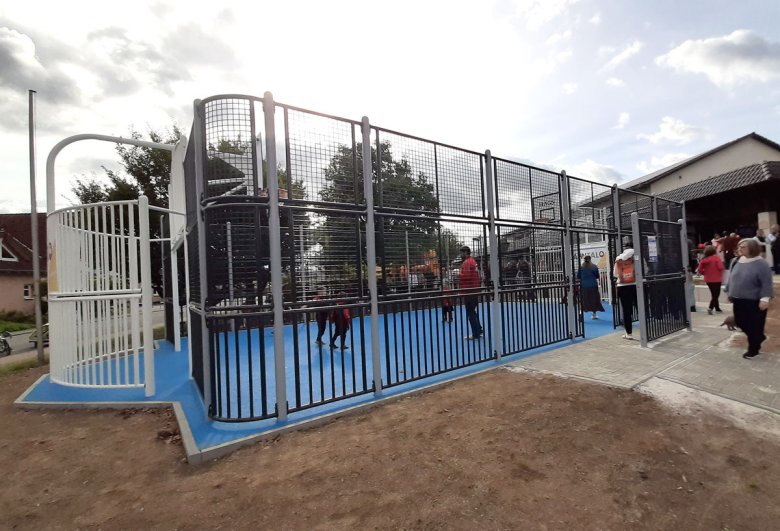 Zahlreiche Sterzhäuser - von klein bis groß - ließen es sich nicht nehmen, die neue Multisportanlage vor dem Haus am Wollenberg gebührend zu feiern. Mehr als 120 Menschen kamen bei gutem Wetter zusammen und nahmen den modernen Multicourt in Augenschein. Dieser wurde mit zwei Toren sowie zwei Körben ausgestattet, ist vollständig umzäunt und mit einem Fallschutzbelag verbaut, der das eventuelle Verletzungsrisiko durch Stürze erheblich reduzieren soll. „Er soll ein Ort des Sports, der Begegnung und der Gemeinschaft sein. Dieser Platz steht allen offen - und ich hoffe, dass er zu einem zentralen Treffpunkt in Sterzhauen wird, wo gemeinsam eine gute Zeit verbracht wird.“, betonte Bürgermeister Carsten Laukel in seiner Begrüßungsrede. „Die neue Sportanlage entstand im Rahmen des anstehenden Umgestaltungsprojekts um das Haus am Wollenberg – einem Projekt, das Sterzhausen nachhaltig verändern wird. Wir sehen also hier den ersten Schritt der Veränderung - die weiteren Maßnahmen folgen“, erklärte Laukel.