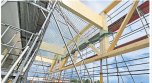Die Anlieferung der ca. 30 m langen Dachbinder war erfolgreich! Eine besondere Herausforderung war dabei die Fertigstellung der gerade sanierten B62 im Bereich Bahnhof Sarnau. Dank der hervorragenden Zusammenarbeit mit Hessen Mobil und der zügigen Sanierungsarbeiten gelang es, die sehr langen Leimbinder planmäßig auf die Baustelle zu bringen. Mit einem Schwertransport wurden die Binder um ca. fünf Uhr morgens über die B3, durch Göttingen, Sarnau und über die Behelfsdurchfahrt am Kreisel Goßfelden auf das Gelände der Multihalle gefahren. Ab kommender Woche erfolgt nun die Dacheindeckung mittels Trapezblech, das Eindringen der Gefälledämmung und die Herstellung der Dachabdichtung.
