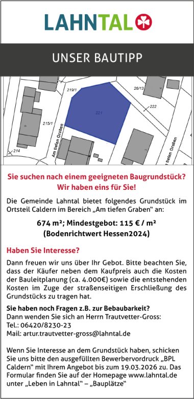 Die Gemeinde Lahntal bietet folgendes Grundstück im Ortsteil Caldern im Bereich „Am tiefen Graben“ an