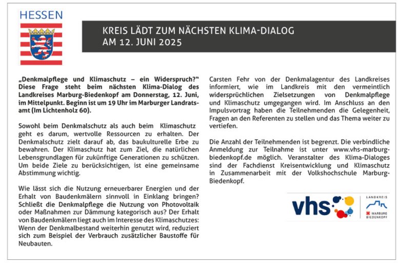 Der Klima-Dialog findet am 23. April 2026 um 18:30 Uhr im Kreissitzungssaal des Landkreises Marburg-Biedenkopf in Marburg-Cappel, Im Lichtenholz 60 statt. Die Anzahl der Teilnehmenden ist begrenzt. Die verbindliche Anmeldung zur kostenfreien Teilnahme ist unter https://www.vhs-marburg-biedenkopf.de möglich.