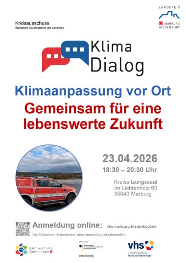 Der Klima-Dialog findet am 23. April 2026 um 18:30 Uhr im Kreissitzungssaal des Landkreises Marburg-Biedenkopf in Marburg-Cappel, Im Lichtenholz 60 statt. Die Anzahl der Teilnehmenden ist begrenzt. Die verbindliche Anmeldung zur kostenfreien Teilnahme ist unter https://www.vhs-marburg-biedenkopf.de möglich.