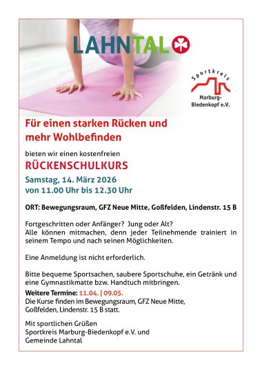 In Kooperation mit dem Sportkreis Marburg – Biedenkopf findet monatlich (seit Januar 2025: jeden zweiten Samstag im Monat) ein kostenloser Rückenschulkurs statt, an dem Jugendlich ab 16 Jahren, Erwachsene aus verschiedenen Bereichen des Lebens und junggebliebene Senioren unverbindlich teilnehmen können.