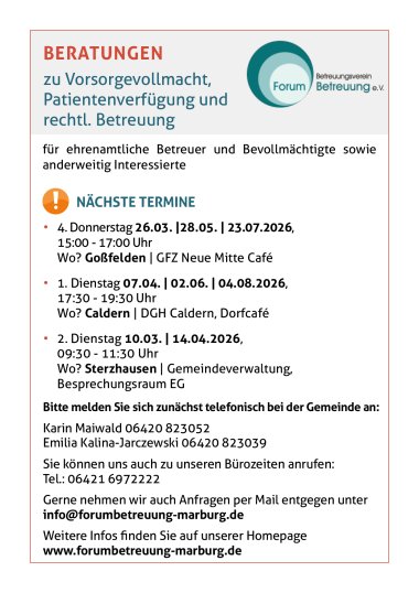 Interessierte sind herzlich eingeladen, ebenfalls an der Rückenschule in Goßfelden teilzunehmen. Der nächste Termin findet am Samstag, den 14. Februar 2026 von 11:00 bis 12:30 Uhr statt. An dieser Stelle möchten wir uns herzlich bei allen bedanken, die dieses Angebot annehmen und regelmäßig an der Rückenschule teilnehmen.