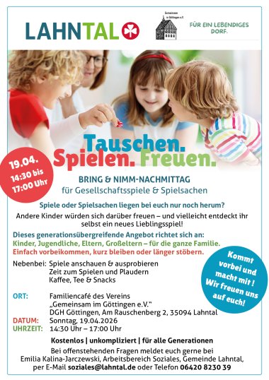 Die Gemeinde Lahntal setzt sich für ein lebendiges Miteinander ein und bietet regelmäßig eine abwechslungsreiche Palette an Projekten und Treffen für unsere Kinder sowie Senioren. Wir möchten nun unser „Programm“ erweitern und bauen generationsübergreifende Angebote in Lahntal aus, um Jung und Alt zusammenzubringen.